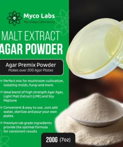 Myco Labs Leichter Malzextrakt (LME) Agar-Pulvermischung – Ergibt über 200 Agarplatten 200 g (7 oz) bringen Sie Ihre Mykologie-Projekte auf ein professionelles Niveau mit dem Myco Labs (LME) Hellen Malzextrakt-Agar Pulver – 200g. Diese hochwertige, vorgemischte Hausrezeptur wurde speziell für die Kultivierung von robustem und vitalem Myzel entwickelt.